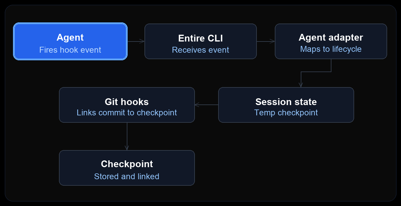 The Entire CLI handles that with agent-specific code for each built-in agent and external agent plugin. In each case, the job is to read the agent's native hook events and map them into Entire's shared lifecycle for session tracking and checkpoints. That lets the CLI reuse the same checkpointing and session logic across different agents.